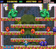 The game play of Snow Bros is similar to Bubble Bobble, released in 1986. The game supports up to two players, with each player taking the part of one of two snowmen Nick and Tom. Each player can throw snow at the enemies. The player must throw snow at each enemy until it is completely covered, when it turns into a snowball. An enemy partially covered in snow cannot move until it shakes it off.